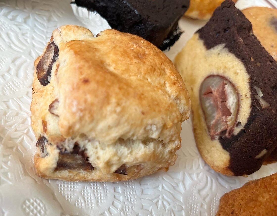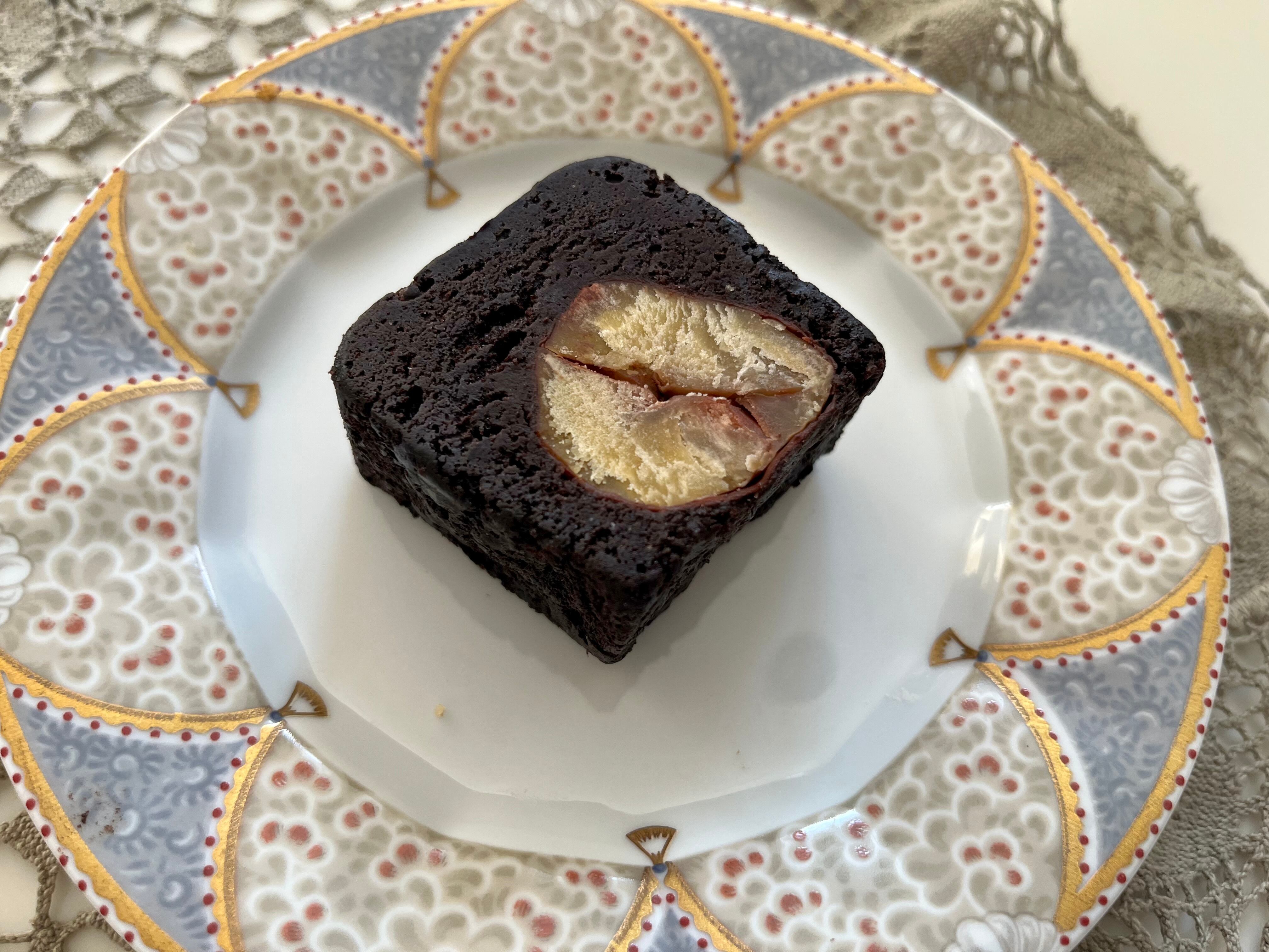詰め合わせの時は栗饅頭の形で焼いています。サバトンのマロンクリームを生地にたっぷりと練り込んで栗の渋皮煮を一個真ん中に入れて焼いています。