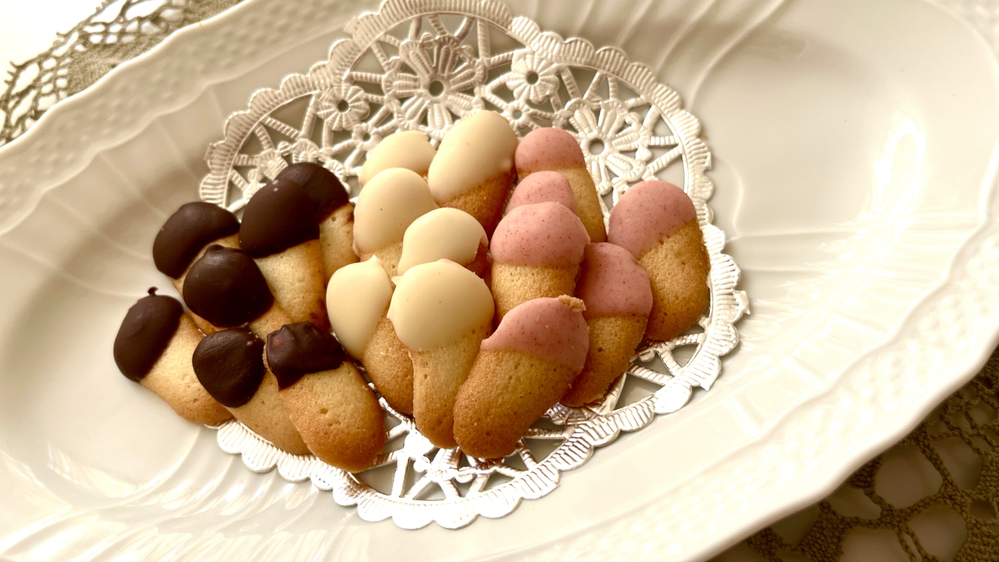 軽い食感が特徴のラングドシャはフランス語で「猫の舌」という意味でそのフランス菓子そのままの形に焼きチョコ掛けにしています。まるでマニキュアを塗った指のようですよね。