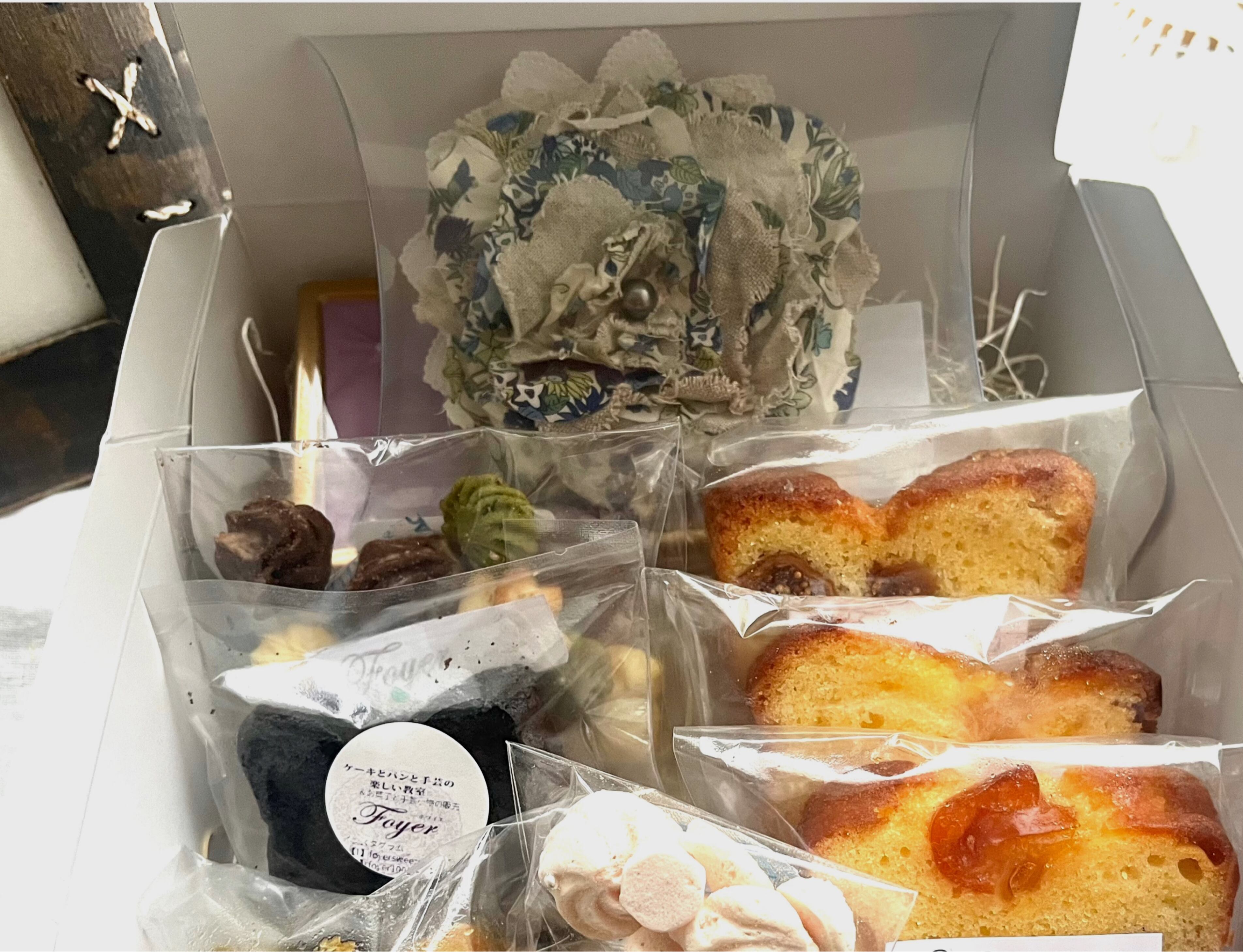 ミニクッキー缶とケーキとクッキーを詰め合わせにしてお届け致します。