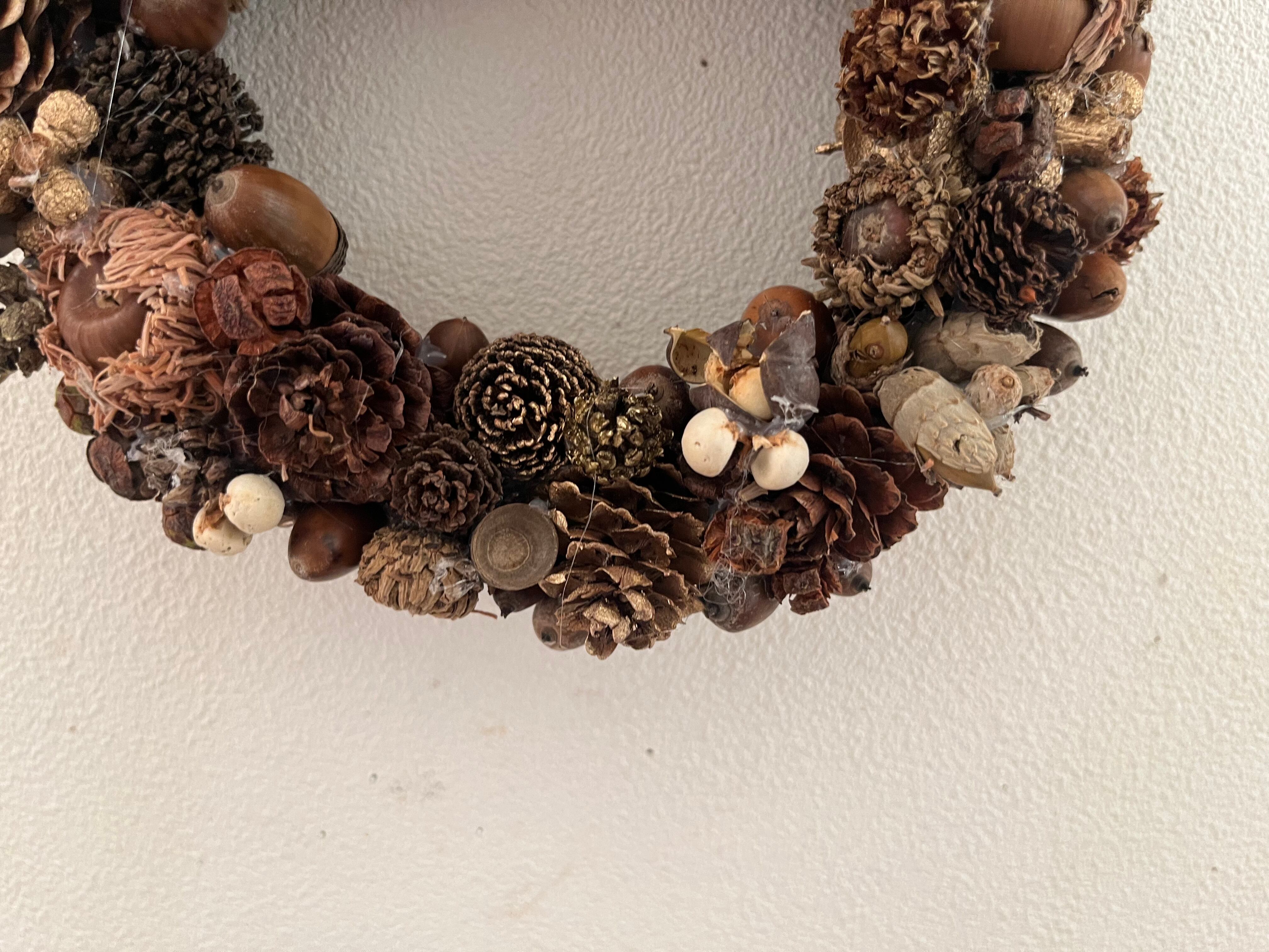 蔓のリースを土台に、沢山の種類の木の実をアレンジしています。