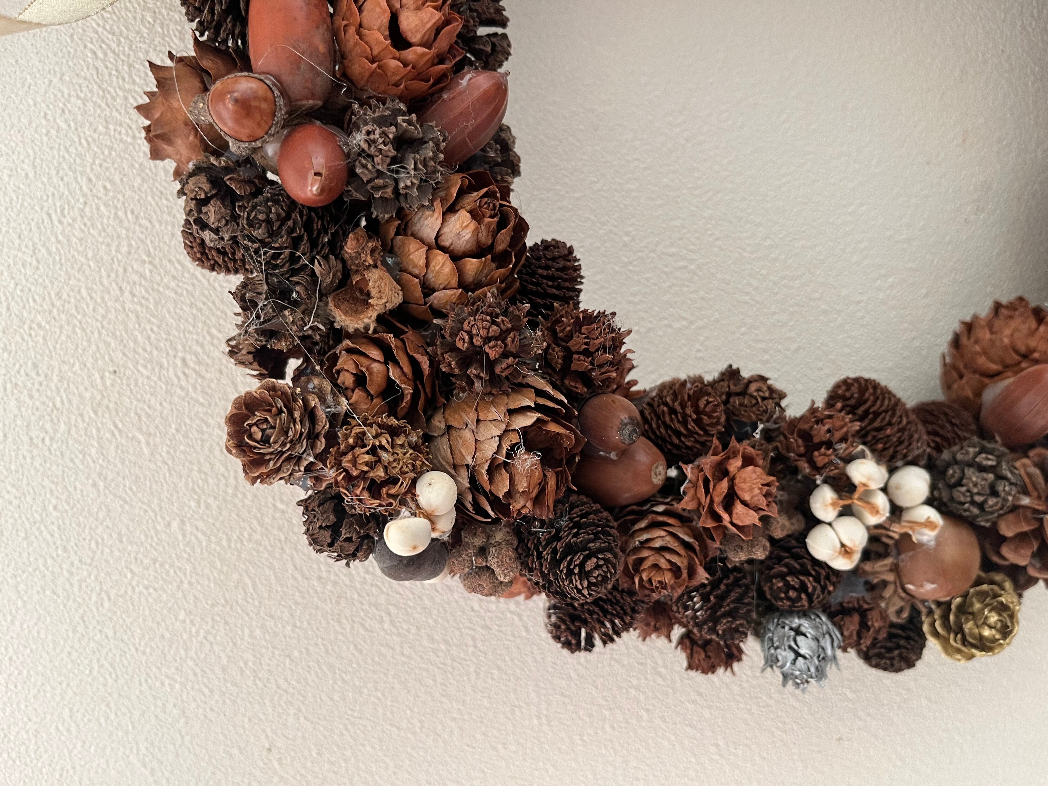 蔓のリースを土台に、沢山の種類の木の実をアレンジしています。